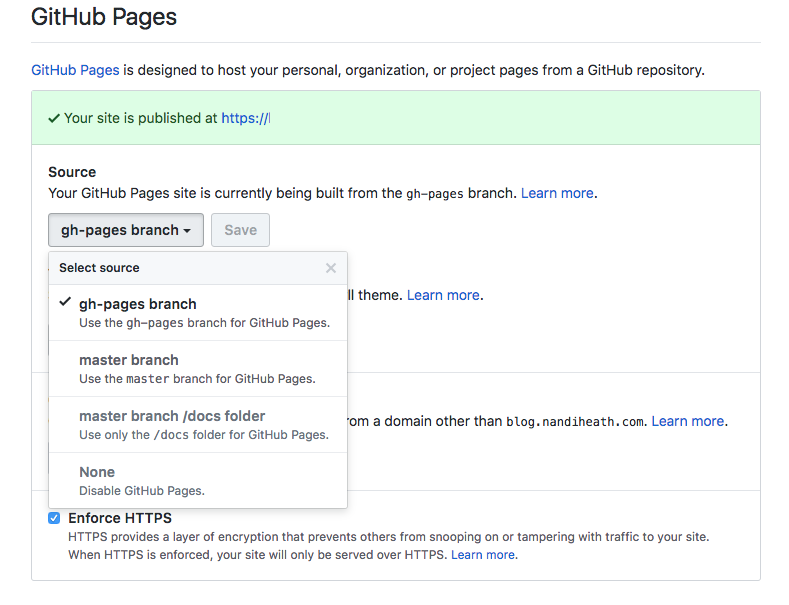 master,gh-pages, or a/docsfolder on yourmasterbranch for Project Pages and other Pages sites that meet certain criteria.